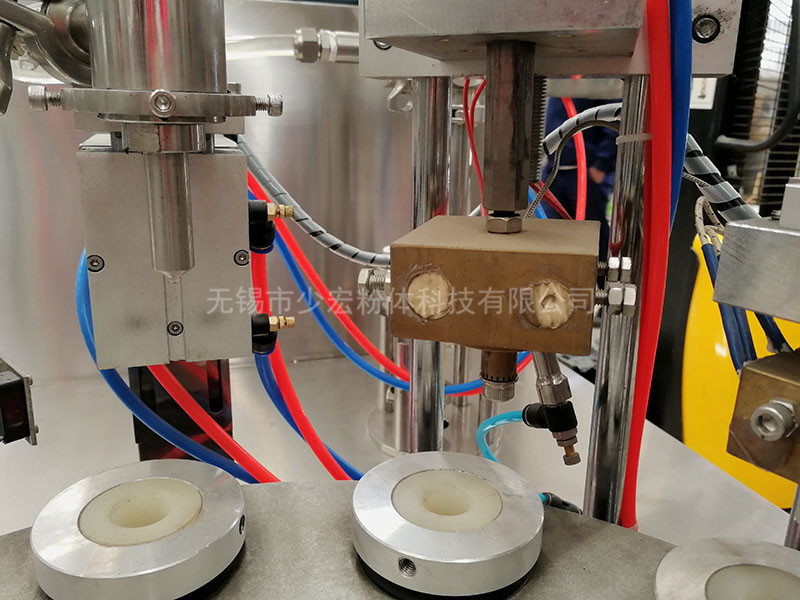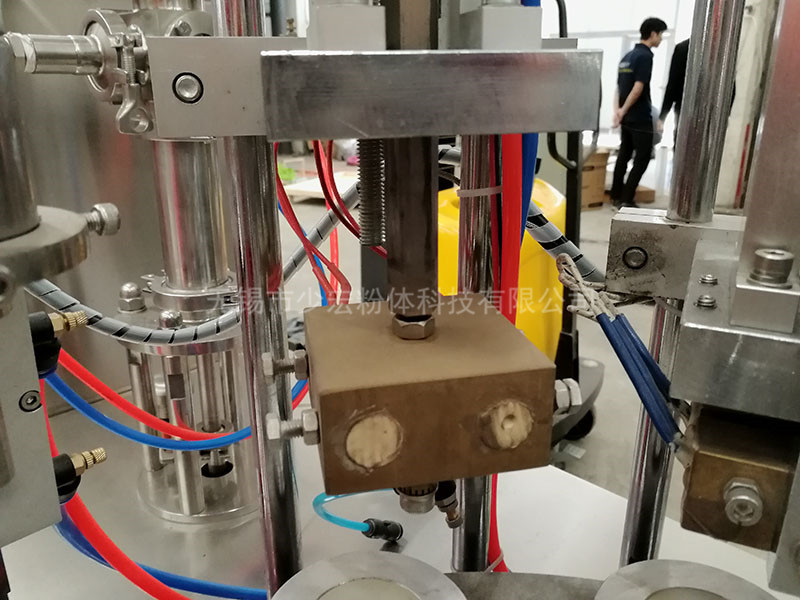 該機(jī)的灌裝、封口、壓齒、換位、定位等均采用機(jī)電、光電、氣泵一體化原理,通過凸輪分度機(jī)構(gòu),換位、定位,氣泵灌裝、封口等動(dòng)作完成,灌裝、加熱、封口、切尾、頂桿等七個(gè)工作程序。所有動(dòng)作均同一輸出同步完成。保證動(dòng)作一體化,提高了動(dòng)作的可靠性和穩(wěn)定性。